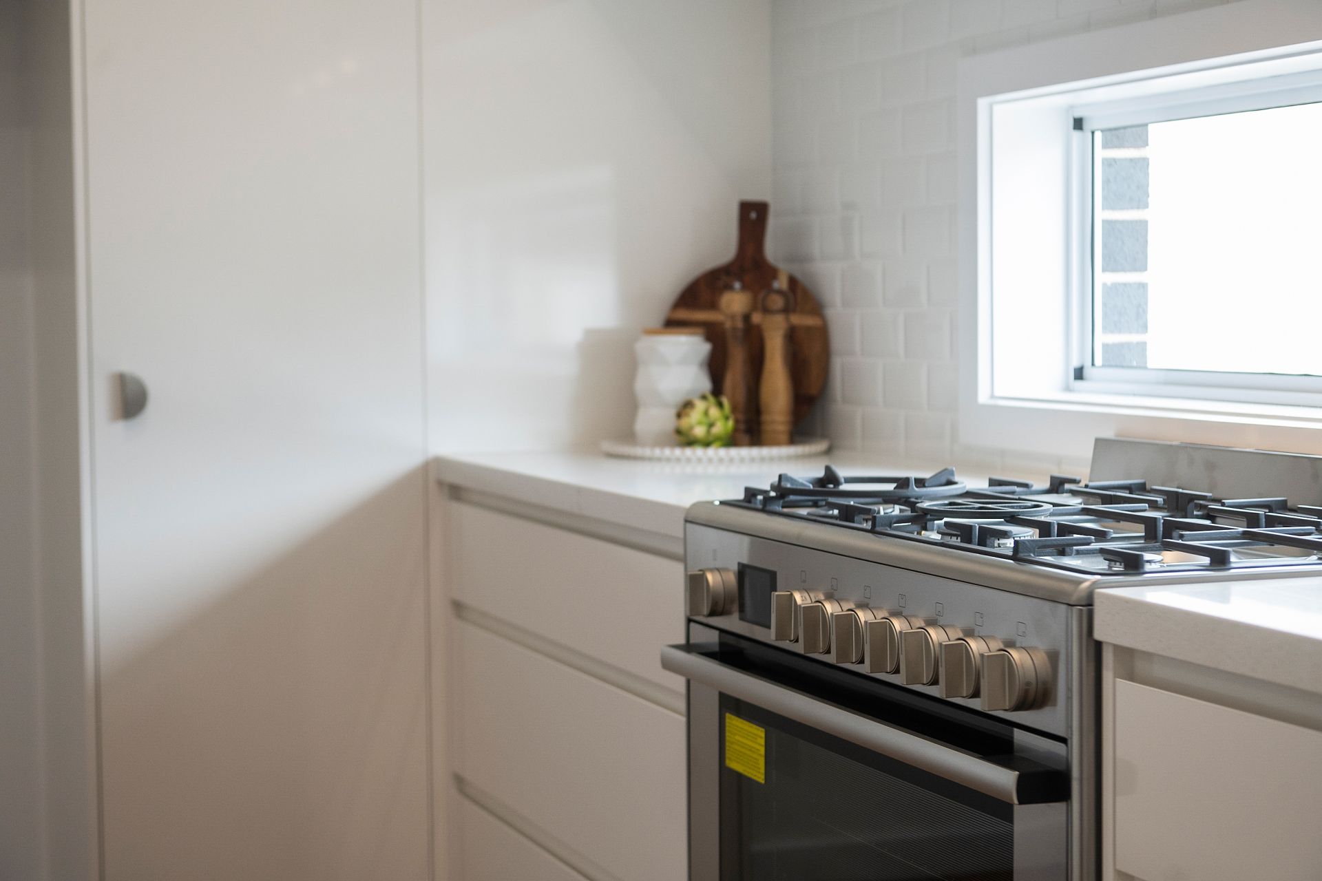 - Elegant kitchen with 40mm Caesarstone benches, 900mm freestanding Bosch cooker, dishwasher, shadowline cabinetry, soft-close doors & drawers