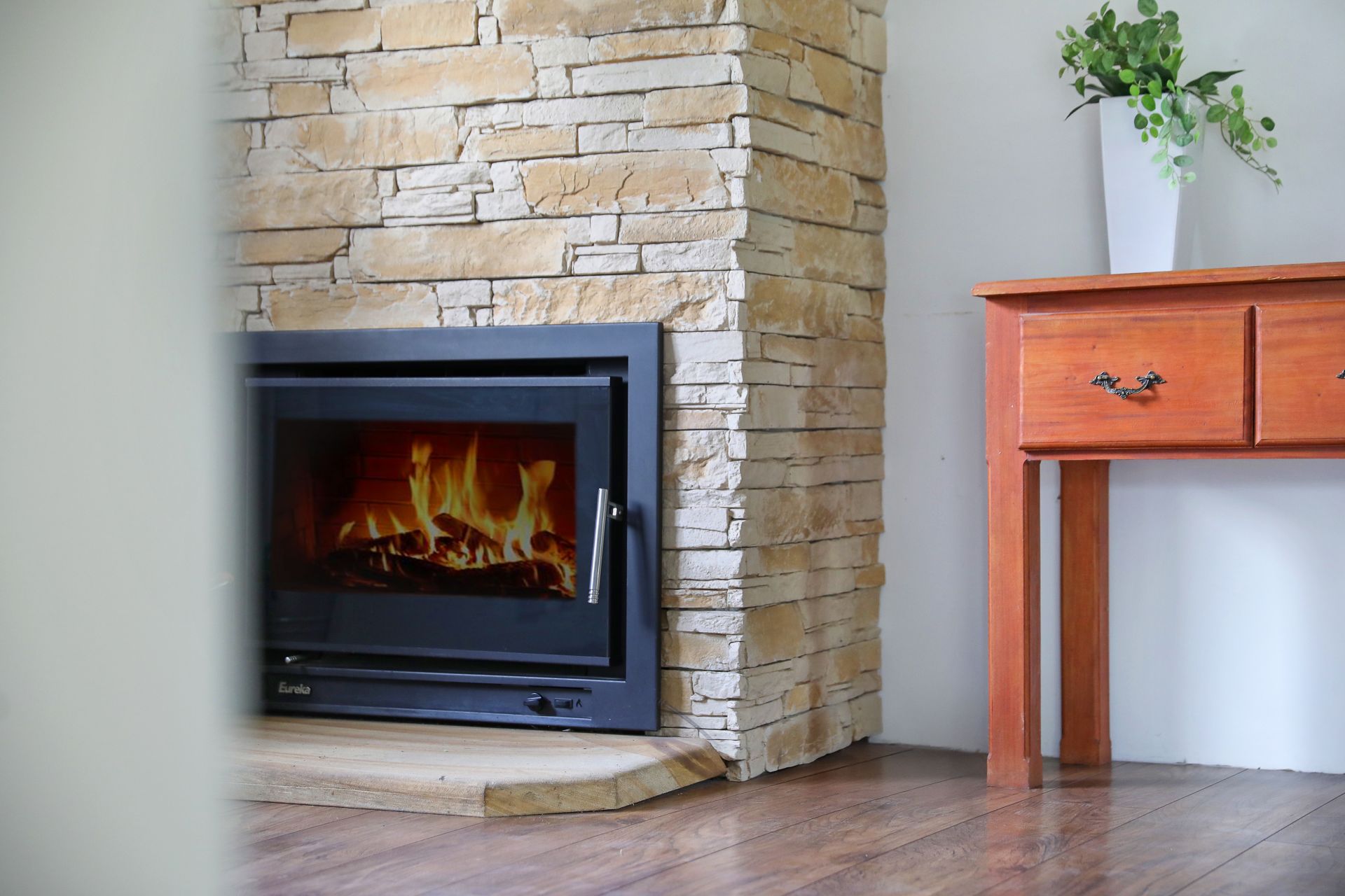 - Lounge room with timber laminate flooring, opening to the dining with slow-combustion fire