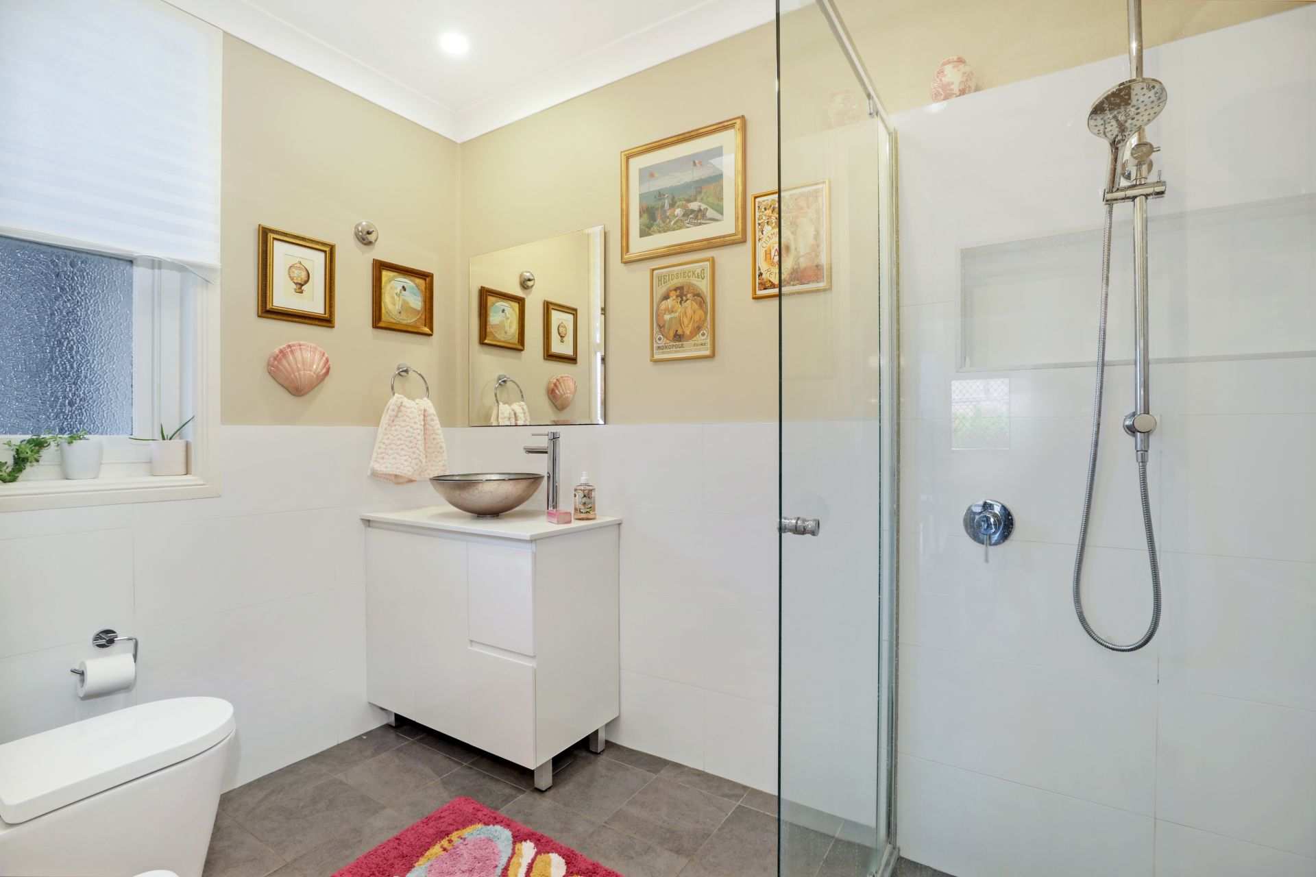 - Modern bathroom with semi-frameless shower, and additional separate toilet